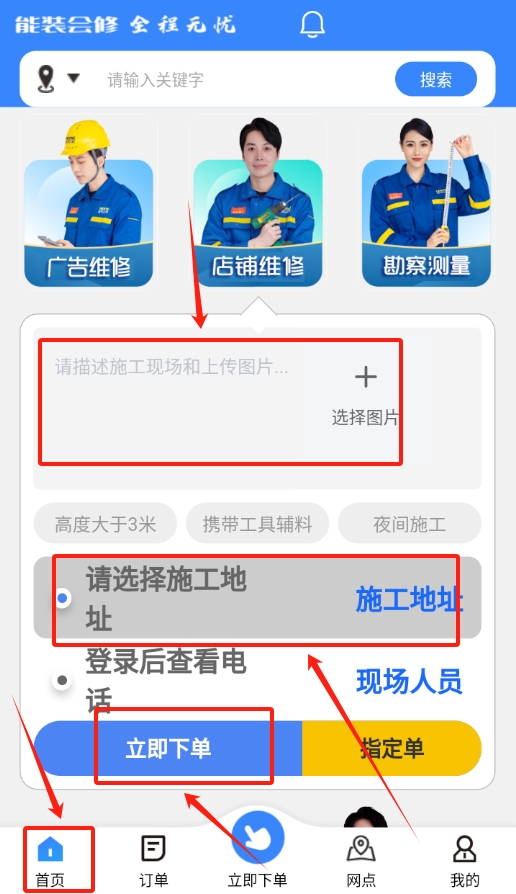 4、登录成功后回到首页,选择店铺维修选项,描述施工现场情况并上传图片,选好施工地址后,点击去下单就可以了。