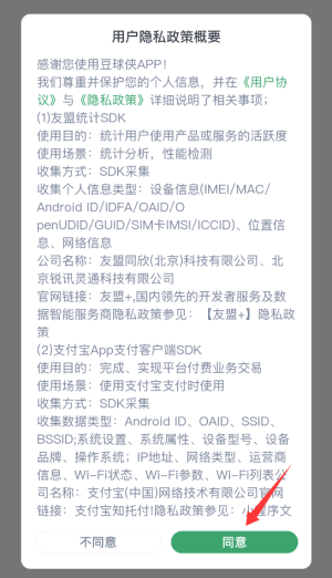 1、启动豆球侠APP后,首次使用需阅读并同意用户协议和隐私政策,点击确认进入主界面。