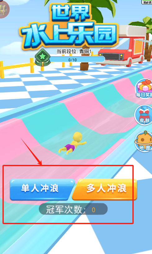 1、点单人冲浪蓝色按钮开始游戏,从青铜1段位起步,争取完成0/10挑战赢取冠军次数。
