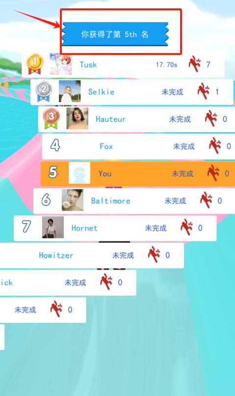 4、虽然只拿到第5名,但别灰心,多练习控制技巧,下次争取超越Tusk的第一名成绩。