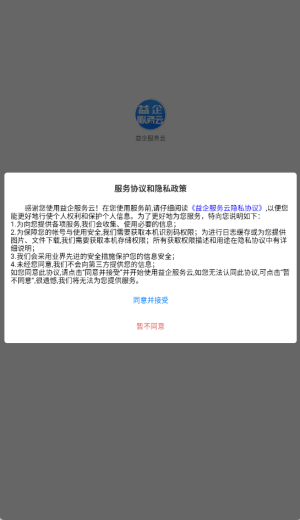 1、启动益企服务云APP后,首次使用需阅读并同意用户协议和隐私政策,点击确认进入主界面。