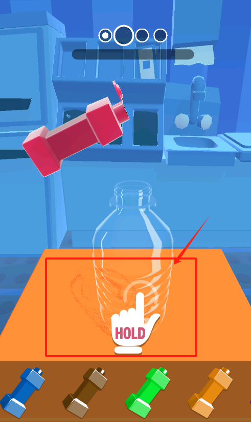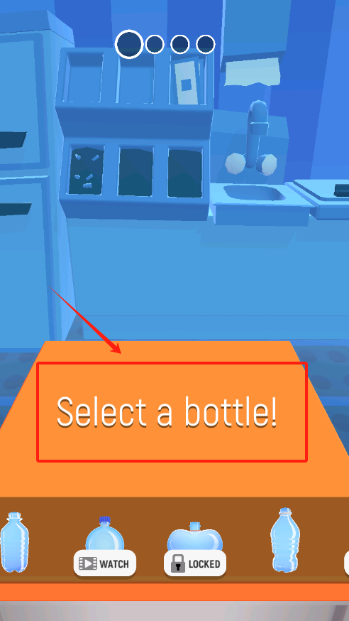 1、点橙色台面上任意透明水瓶开始游戏,别管右边锁着的,看广告能解锁更多瓶子。