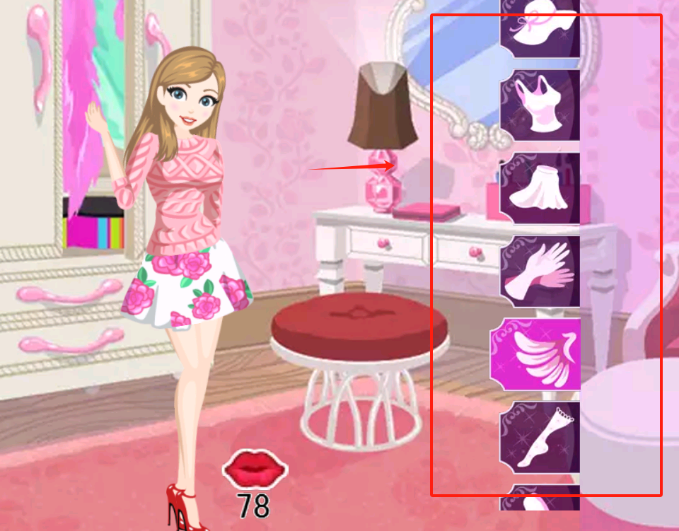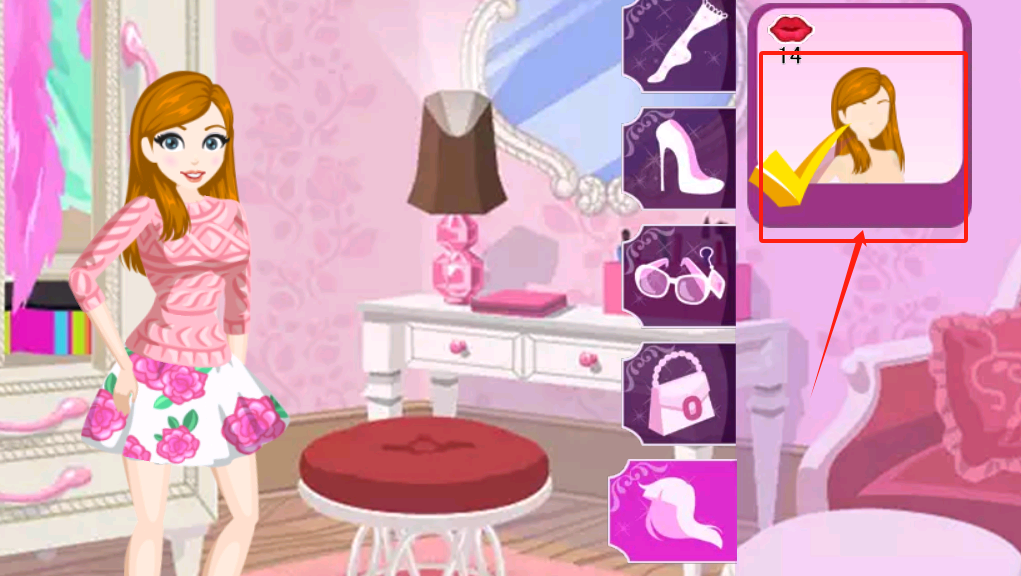 4、点红唇图案旁的数字14进入商店,用金币买高跟鞋等道具,买完拖到女孩身上换装。