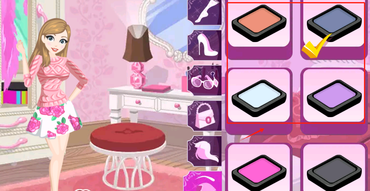 3、用鼠标点右侧眼影盘选颜色,再点女孩眼睛给她涂上,选错颜色可以重涂别担心。