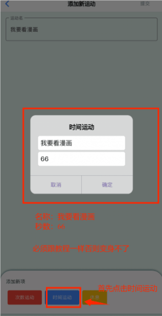 4、添加运动者成功后,点击底部时间运动,然后输入名称【我要看漫画】【66】,确定以后即可完成IOS变身。