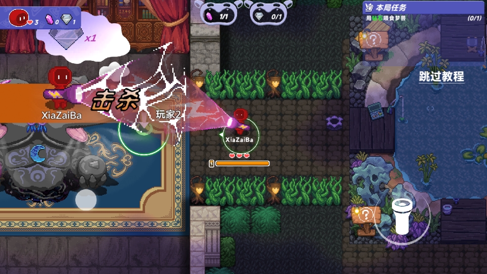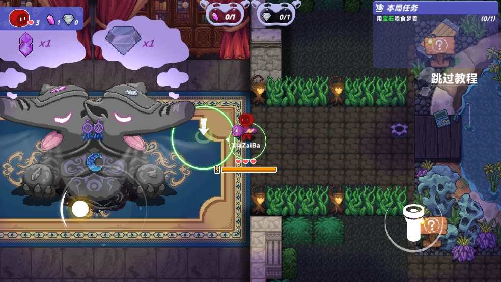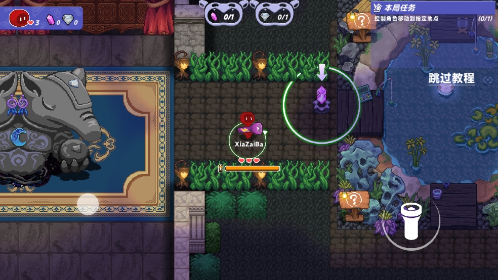 1、玩家需要操纵自己的角色进行移动,移动到紫色宝石进行收集;