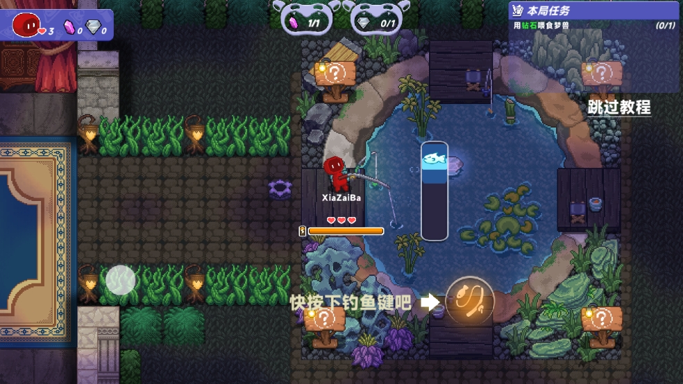 3、来到池塘边进行钓鱼,通过钓鱼可以收集钻石帮助自己闯关;
