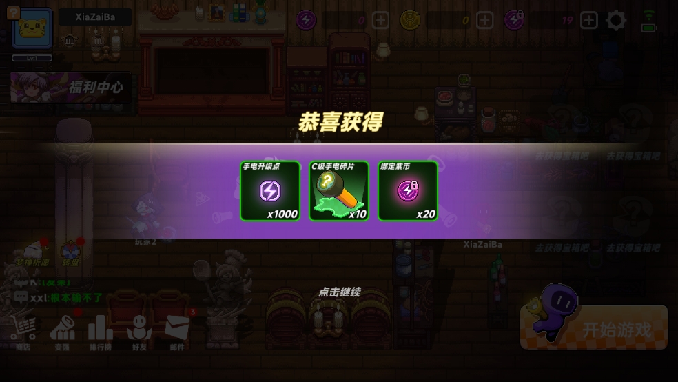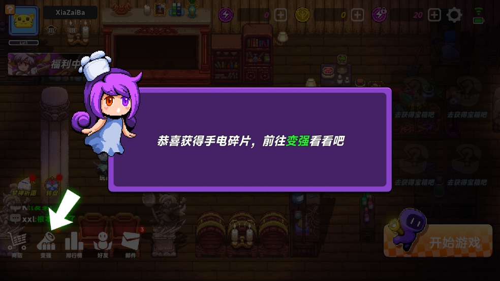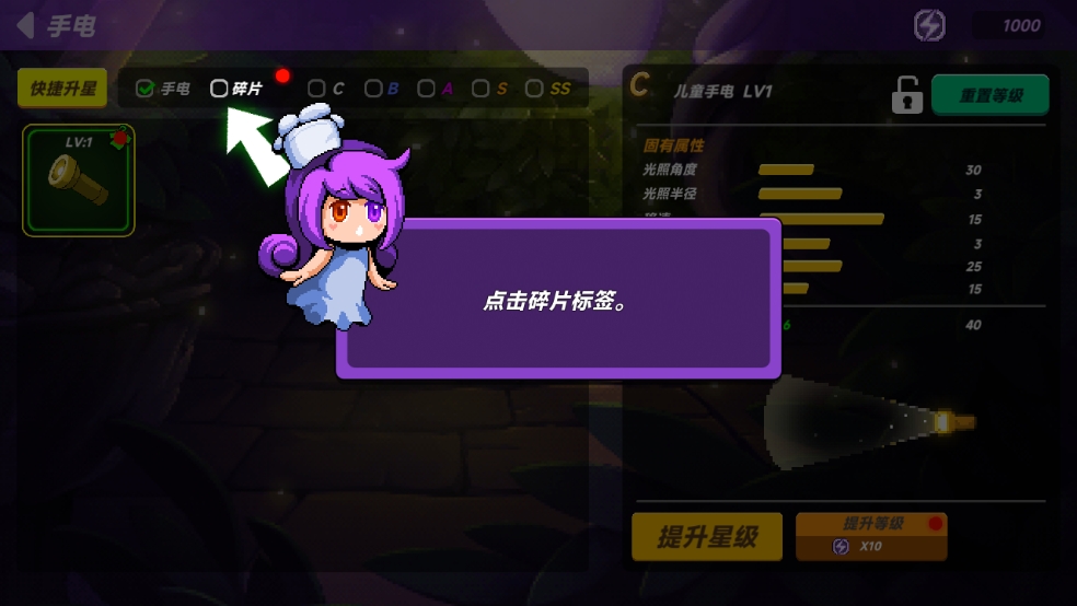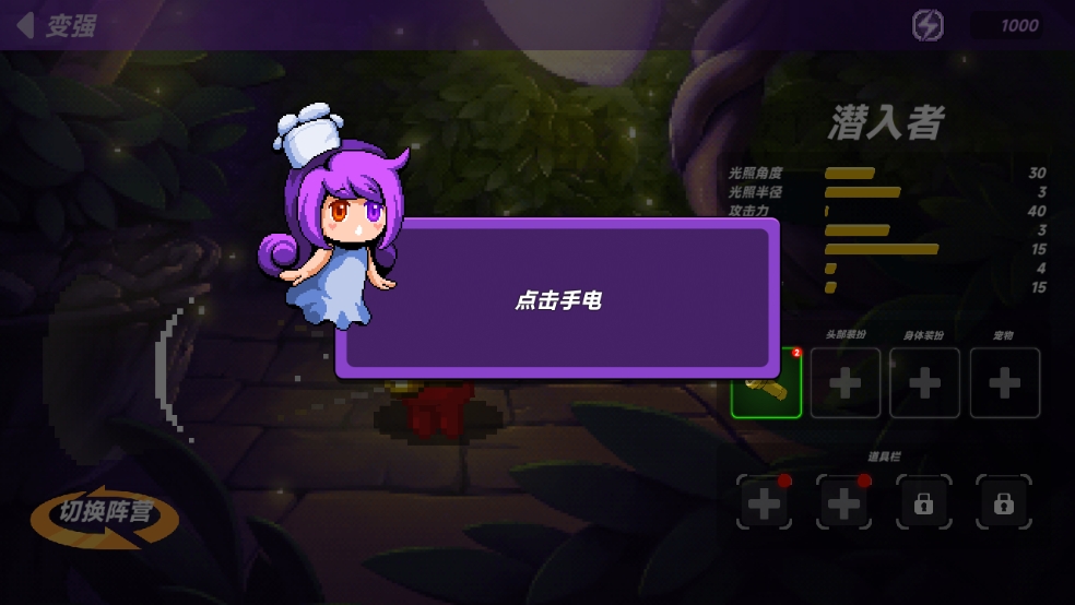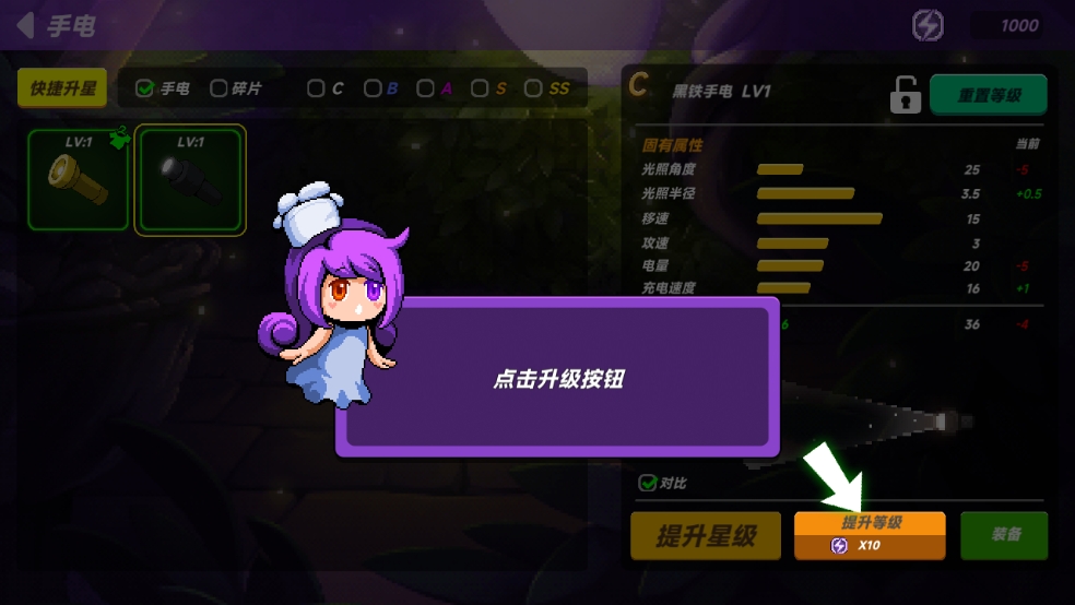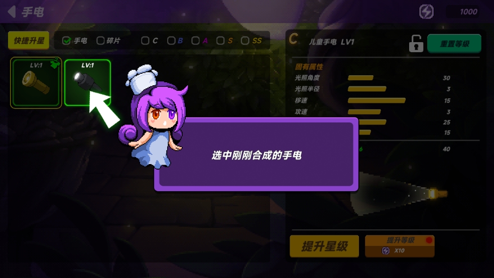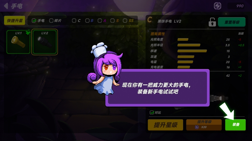 10、装备上自己刚刚强化升级的手电,提升自己角色的战斗力来顺利冒险。