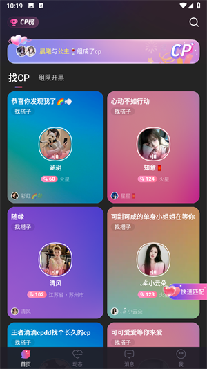 皮咔皮咔是一款极其优质的交友社交软件,会给你带来非常轻松的社交体验,会给你极致的使用感,同时还会拥有独特的cp房社交方式,超级的有趣,有多种的社交方式为你提供,还会有有很多的主题聊天房间进行分享,非常的多样,会支持多种的聊天方式,视频还是语音都可以,满足你的多种需求,里面会提供动态广场,帮你铺桌美好的瞬间,还可以在房间里进行组队开黑,直接找感兴趣的游戏并寻找队友资源进行组队,还有相应的动态广场,你可以浏览各种最新的动态内容。