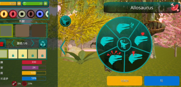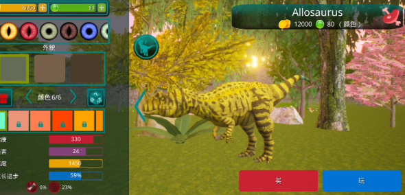 3、自定义的装扮系统,捏造专属的恐龙形象,在左边可以编辑各种外貌和颜色。
