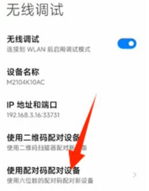 2、在开启无线调试后,直接就可以在下方选择“使用配对码配对设备”,这里就会弹出WLAN配对码和IP地址和端口。