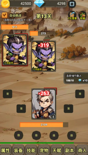 2、通过不断的战斗来提升角色的实力,从天赋、宠物、装备方式来提升实力,应对大量危险强敌。