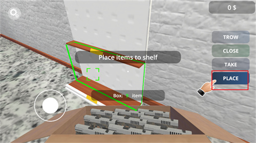 5、纸箱在打开的状态下玩家可以在搬运纸箱的状态中将其中的商品进行上架处理,点击place按钮即可将商品上架到货架上;