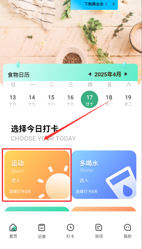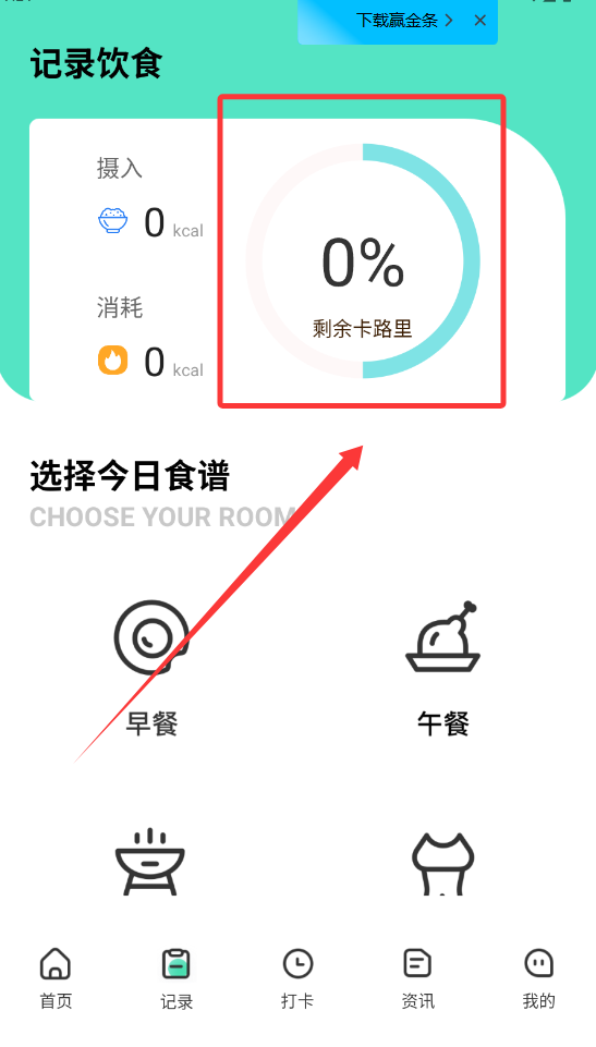 2、点击“记录”,可以记录我们每日摄入的卡路里。