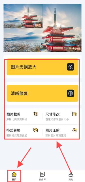 1、打开软件后,首页可以把图片无损放大、可以清晰修复、还可以剪裁尺寸等。