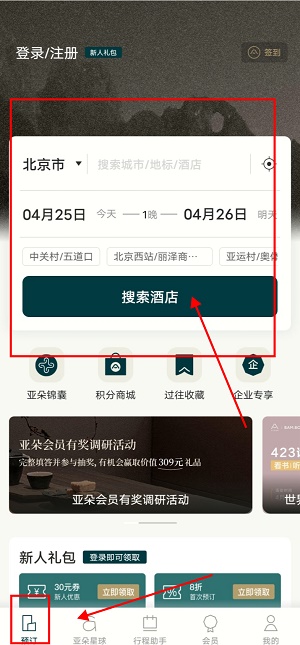 3、在预定页面中输入城市地标日期就可以点击“搜索酒店”,就可以查询酒店预订了。