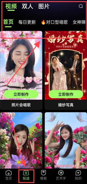 2、玩法页面有照片唱歌、双人视频制作等玩法。
