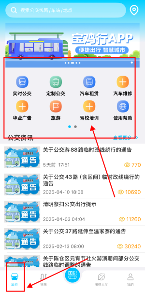 3、在出行页面中还可以查看到实时公交、定制公交等服务。