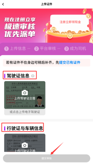 1、注册认证提交驾驶证、行驶证等资料,48小时内完成资质审核。