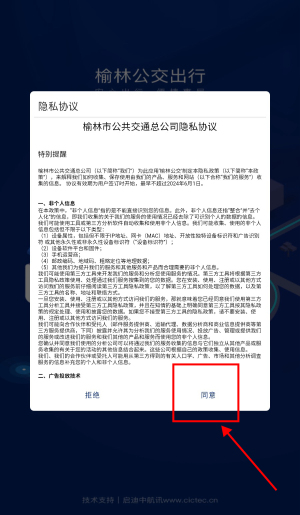 1、打开榆林公交app,点击“同意”。