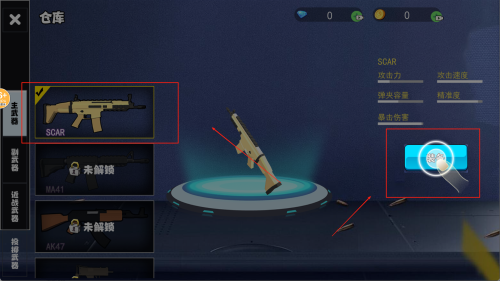 1、进入游戏后外卖先进入仓库装备解锁的武器。