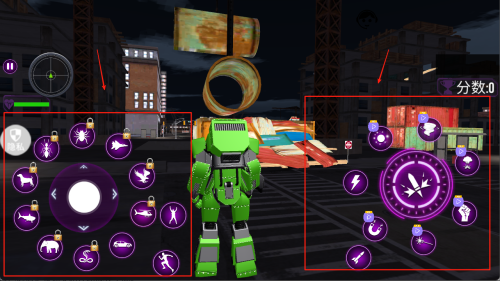 3、左边是移动摇杆及变形,右侧是攻击及技能,玩家可以在地图尽情的破坏。
