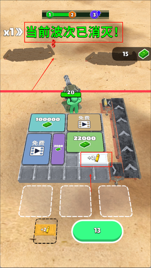 2,初始拥有基础防御塔,通过合成相同子弹模块来提升火力,强化防御塔性能,有效打击敌人。