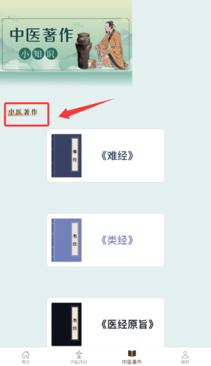 1、启动应用后,在主页面菜单栏选择"中医著作"功能按钮进入。