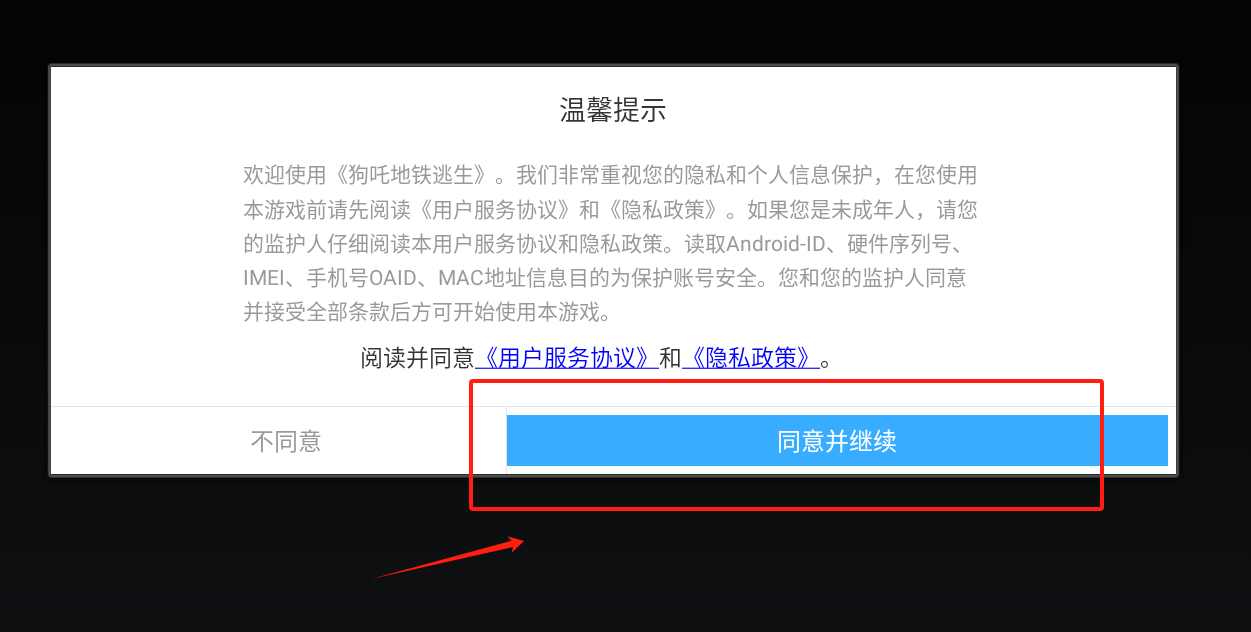 1、屏幕上弹出白框提示,点蓝色阅读并同意才能玩,不同意就点左边灰色按钮。