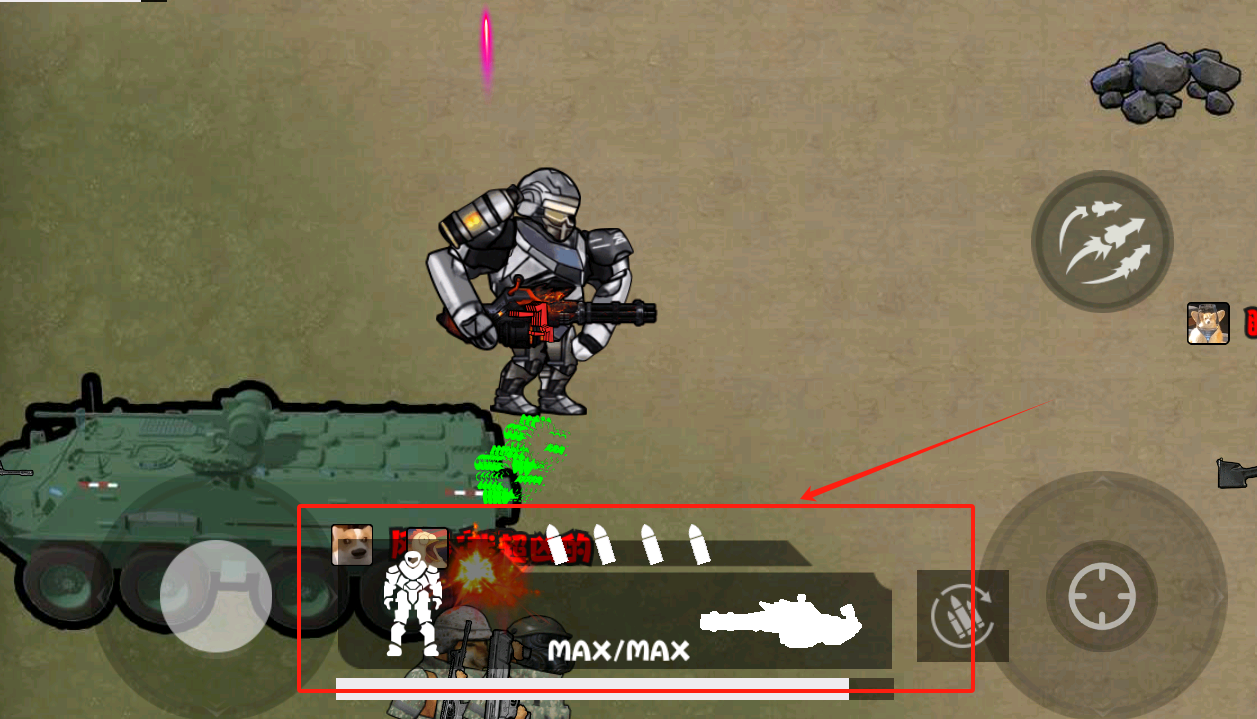 3、画面中间是机器人角色,下方状态条显示满血,旁边按钮能操控射击和换武器。
