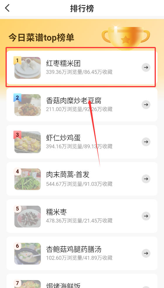 1、进入首页,可以在排行榜内查询需要食谱,点击进入即可。