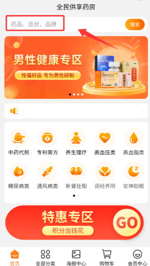 1、启动应用后,点击顶部搜索图标进入药品查询页面。