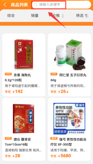 2、输入药品名称或症状关键词,系统自动匹配相关商品列表。