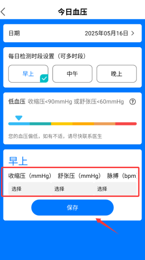 2、选择测量时段(如早晨/晚间)并填写收缩压、舒张压数值。