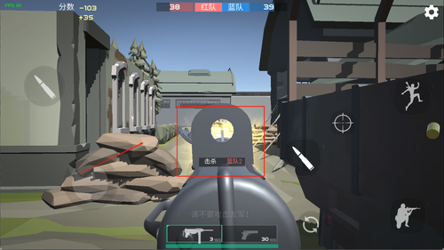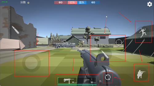 2、屏幕左边是虚拟摇杆控制移动方向,右边设有射击、跳跃和换弹按钮,操作直观适合新手快速上手。