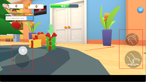2、使用虚拟摇杆控制肥猫移动,点击跳跃或互动按钮进行攀爬、推动家具等动作,完成指定破坏目标或整蛊主人。