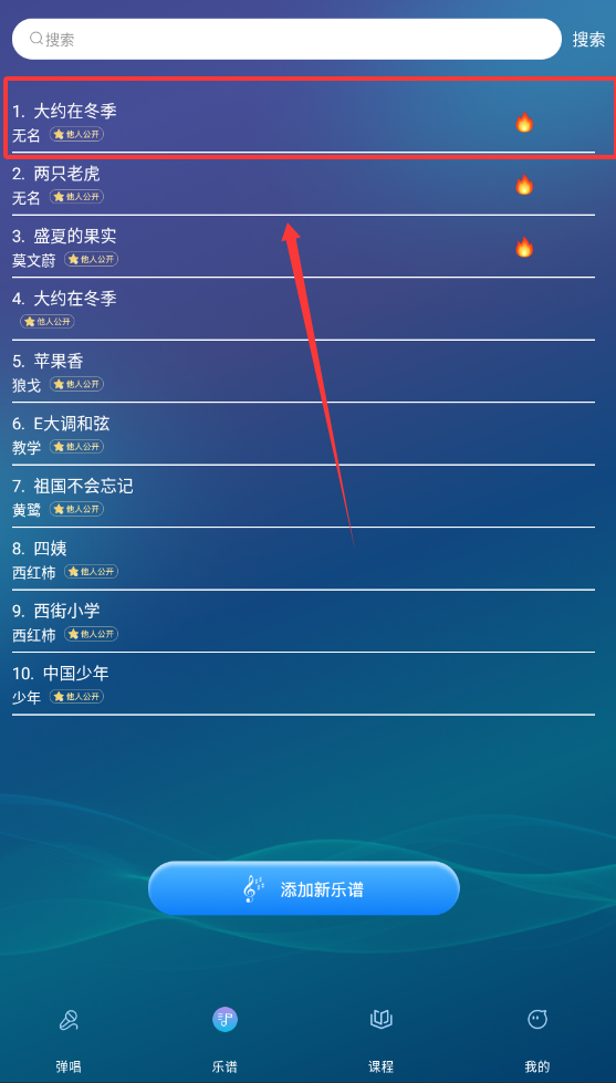 1、曲谱检索功能高效便捷,输入关键词即可快速定位目标乐谱,节省用户查找时间并提高练习针对性。