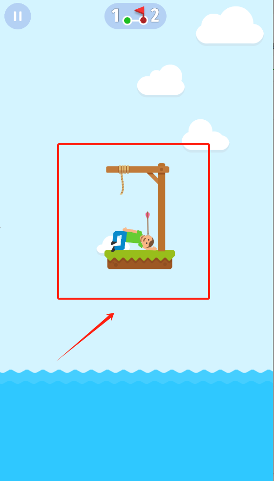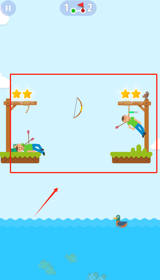 1、点击划动开始游戏,用手指滑动屏幕射箭救人,别让他掉进水里。
