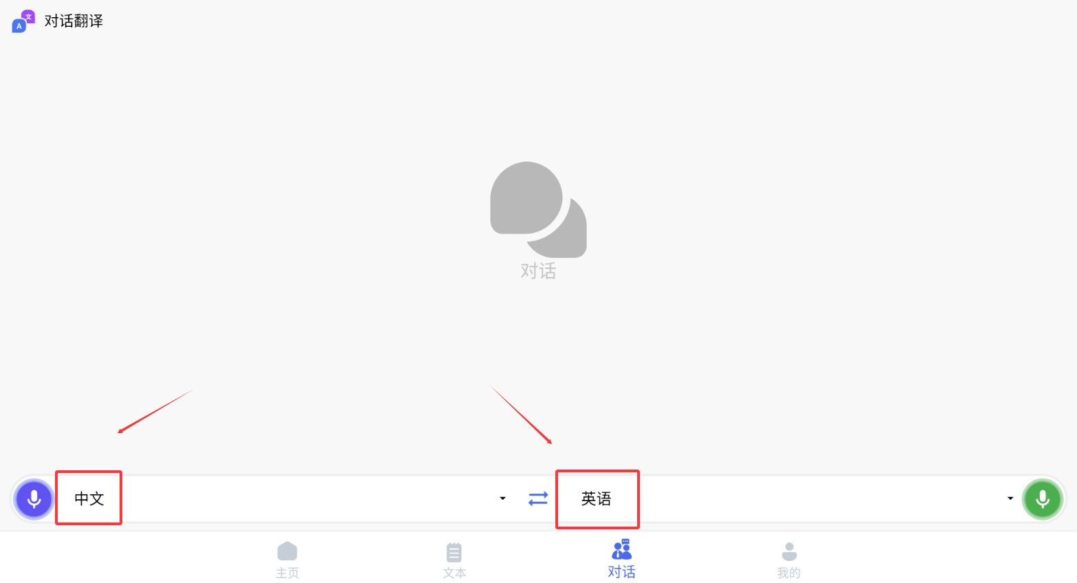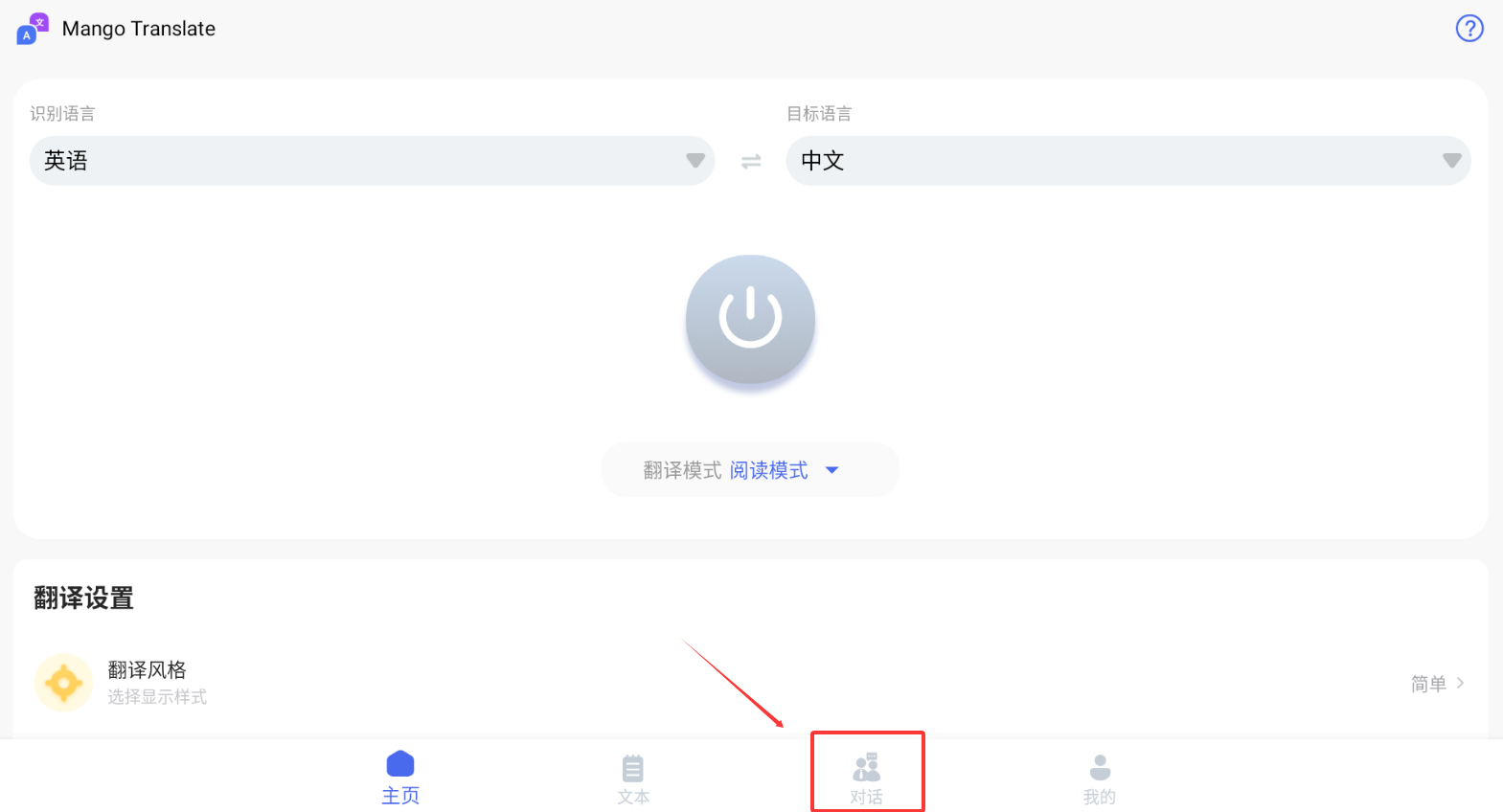 1、启动芒果翻译APP后,在底部导航栏选择"对话"功能,进入语音翻译界面。