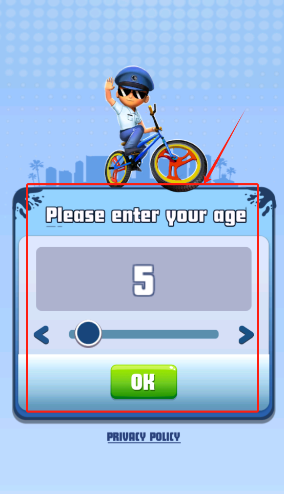 2、输入年龄后点绿色OK,已有数字5可用上下箭头调整,注意隐私政策提示。