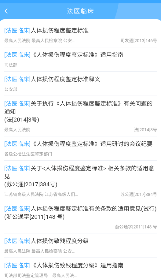 1、进入法医检验APP后,在功能界面选择"临床鉴定"模块,浏览相关检验标准目录。