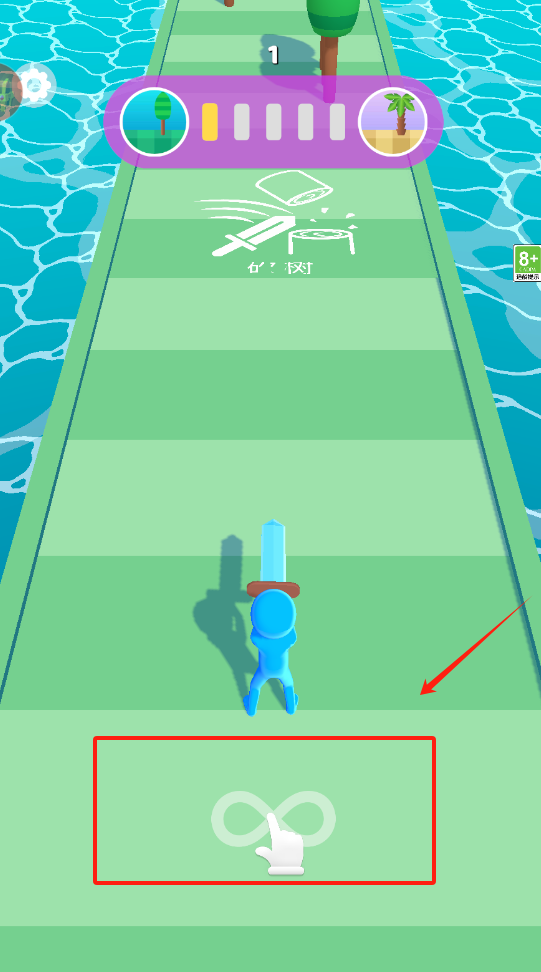 1、蓝色小人持剑跑酷,看到伐树提示就砍树,点击无穷符号继续前进。