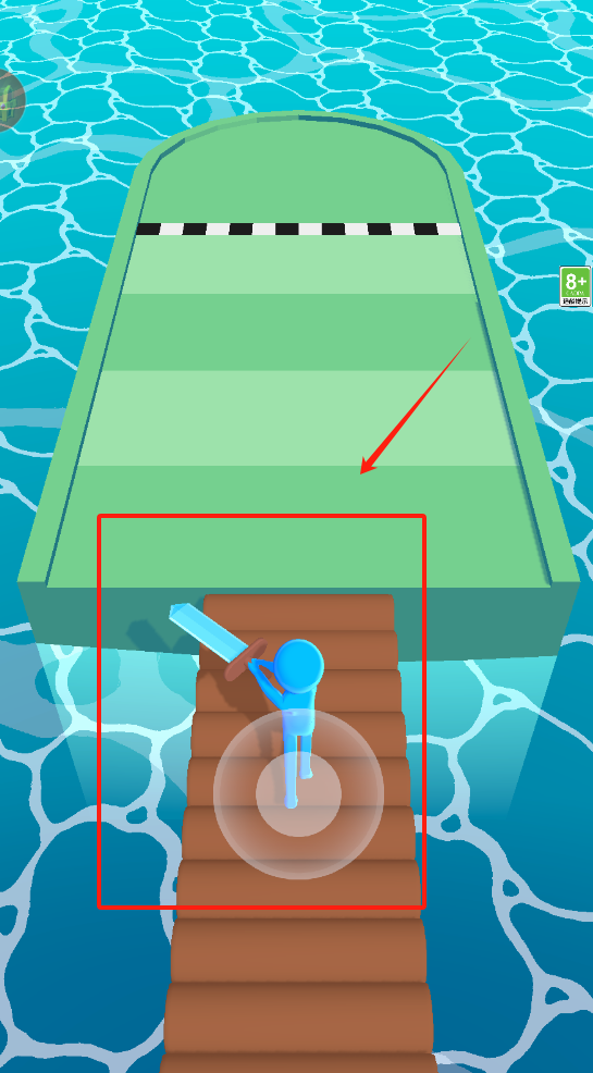 2、蓝色小人站木板拿长条物,前方有绿色平台,准备跳跃过去。