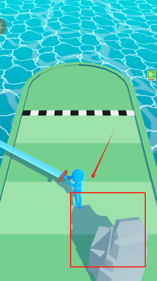 3、蓝色小人持剑站平台,注意右下角灰色石头,小心别掉进水里。
