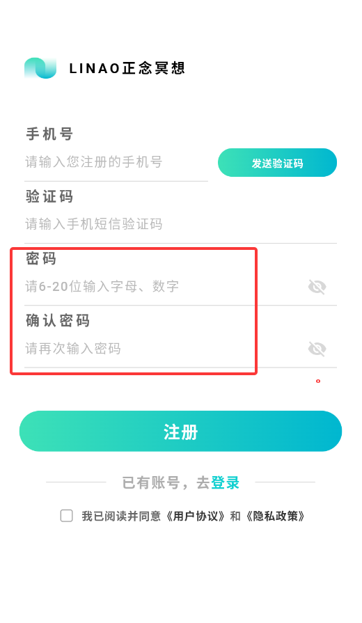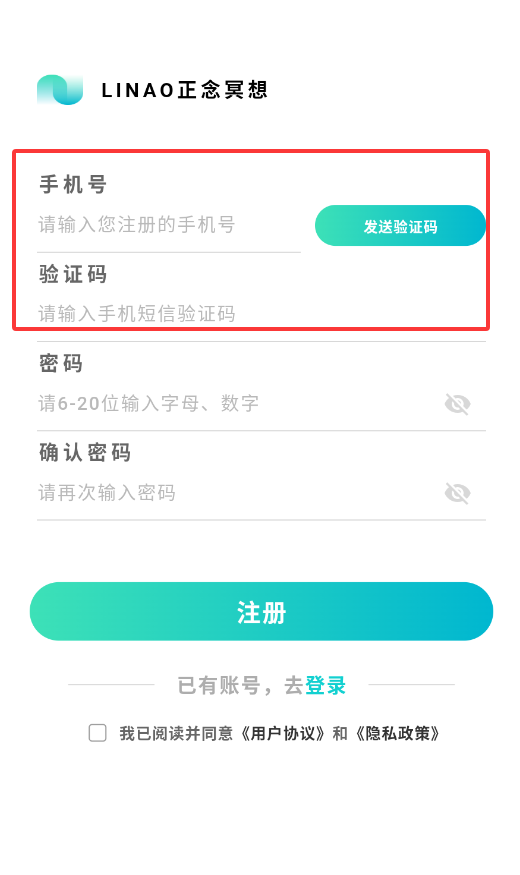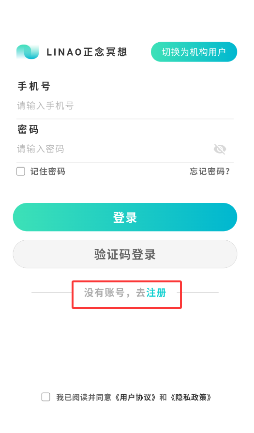 1、启动LINAO正念冥想APP后,在登录页面点击"注册账号"按钮进入注册流程。