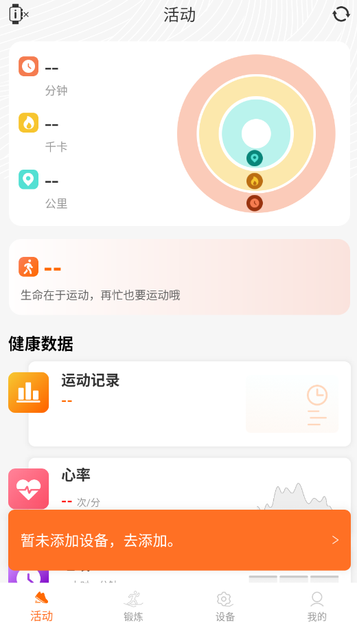1、启动IMIKI Watch APP后,点击底部导航栏的"添加设备"按钮进入配对界面。