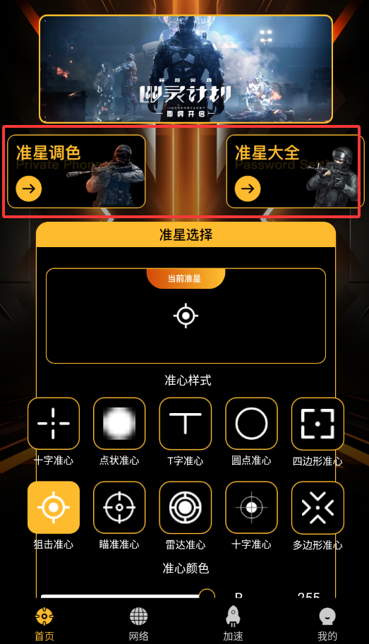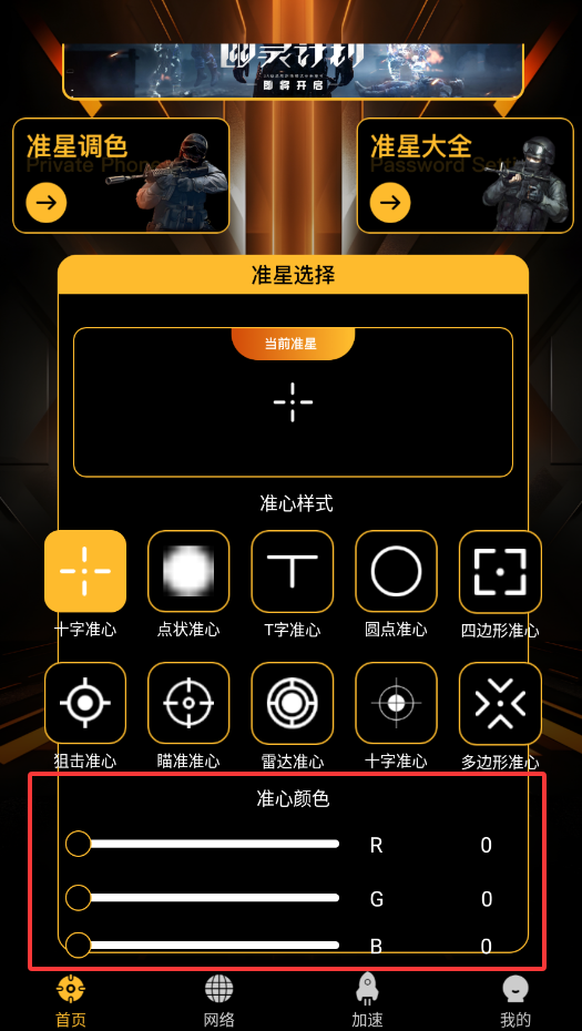 1、启动瞄准实验室pro APP后,在"准星选择"界面可自定义准星颜色、形状等视觉参数。