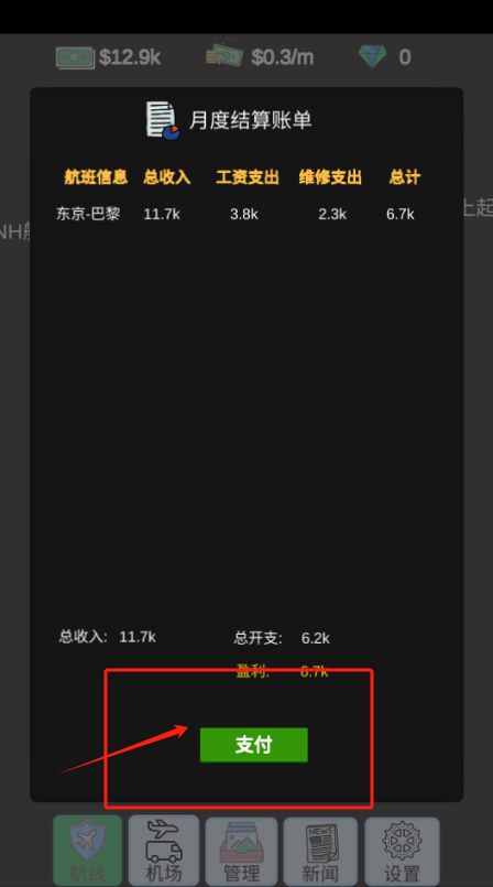 1、点击绿色支付按钮,确认月度账单结算,查看航班收支情况。