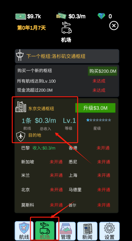 3、在机场页面,查看东京枢纽详情,点击升级按钮提升枢纽等级。