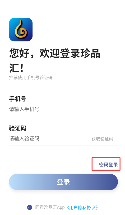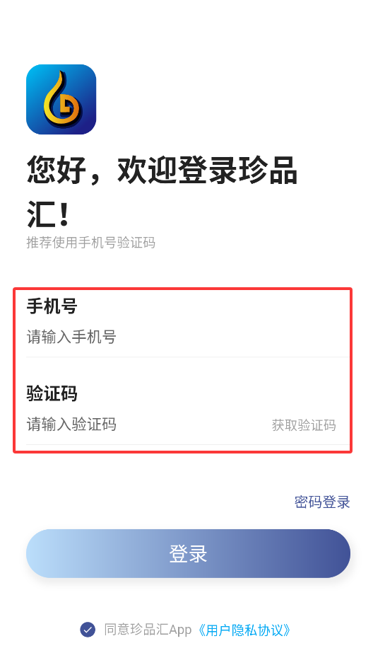 1、启动珍品汇APP后,在登录页面输入手机号码并点击获取验证码完成短信验证。